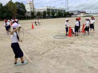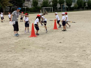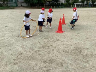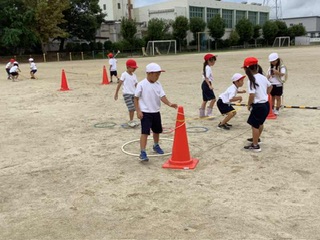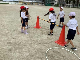 1年生 体育でした。グループで道具を使って、跳んだりくぐったり、片足跳びをしたりするコースを考えてつくっていました。自分たちで考えたコースに挑戦して楽しそうでした。