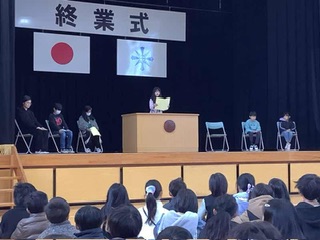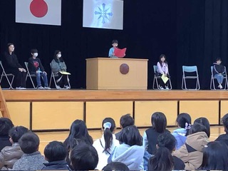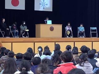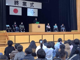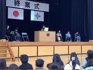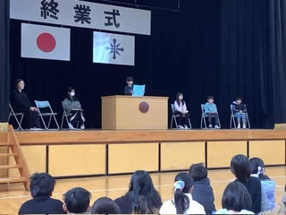 2学期の終業式を行いました。静かに入場し、話をしっかり聞いて、校歌を元気に歌いました。式終了後には、各学年の代表者が2学期に頑張ったことをステージで発表しました。