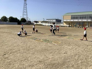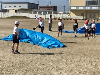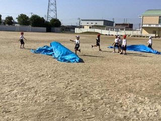 1年生 体育 風でいろんな形に膨らむブルーシートを跳び越していました。臨機応変にジャンプの高さや幅を変えて跳び越すことは良い運動になります。