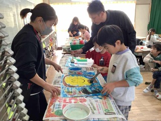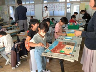 1年生 図工 絵の背景を絵の具で塗っていました。自分のイメージに合った色を選んでいました。