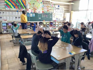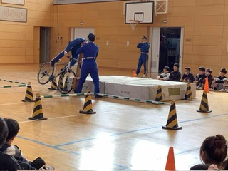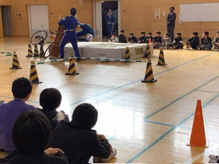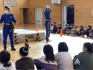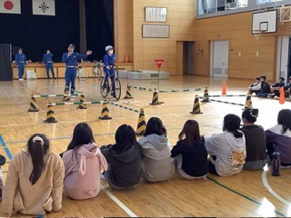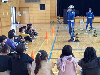 6年生 交通安全教室 県警の方に来ていただいて、ヘルメットを着けることの大切さを実演で教えてくださいました。また、自転車事故で多いとび出しについても、実際に体験しながら学びました。