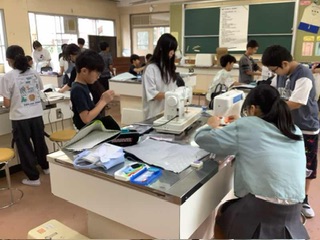 6年生 家庭科 ナップサックをミシンで作っています。ミシンの使い方も上手になってきました。