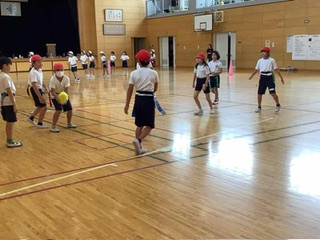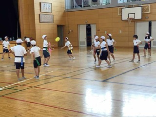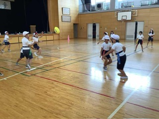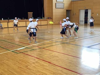 4年生 先日、ラグビーの選手にタグラグビーを教わりました。体育で続けてタグラグビーの練習を続けています。