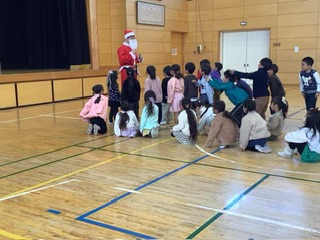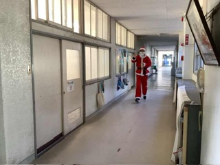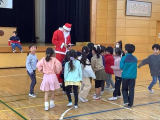 サンタクロースを廊下で発見しました。学級レクにサンタが登場したようです。
